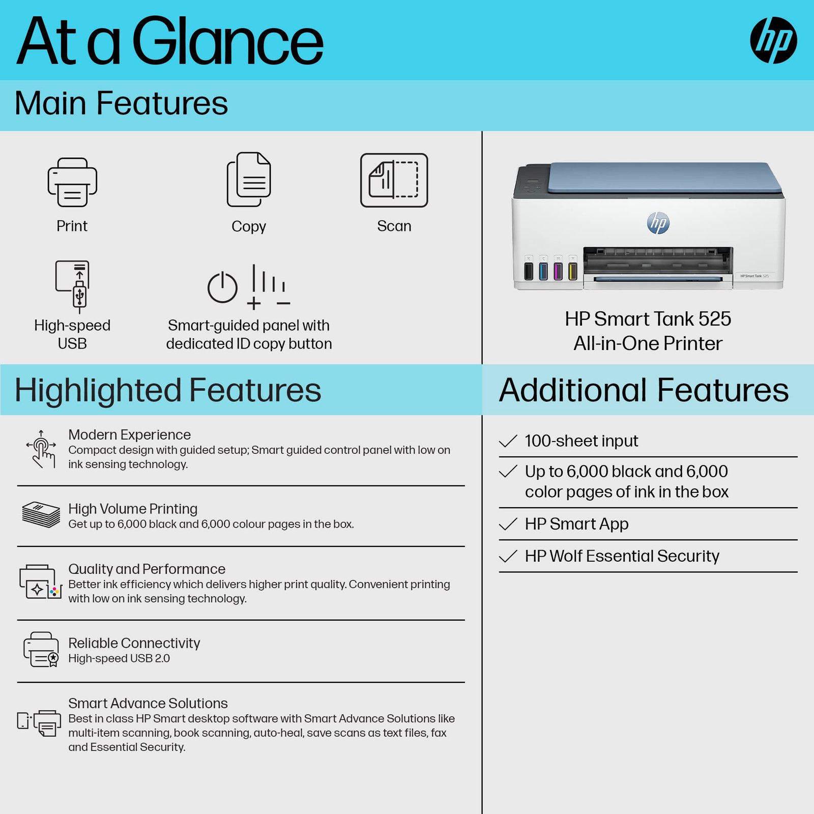 - Additional Printer Function:For Home and Small Offices, Included Components: HP Smart Tank 525 All-in-One Printer; HP GT53XL Black Original ink Bottle; HP GT52 Cyan Original Ink bottle; HP GT52 Magenta Original Ink bottle; HP GT52 Yellow Original Ink bottle; HP Black Printhead; HP Tri-color Printhead; Power cord; Ink caution flyer; Setup guide; Reference guide; Regulatory flyers; Warranty flyers