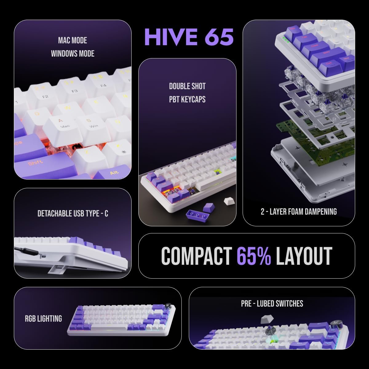 Details: Kreo Hive 65% Compact Mechanical Gaming Keyboard Wired, Customizable RGB Keyboard , Pre-Lubed Switches, 2-Layer Foam, Multi OS Keyboard Customization Wired Gaming Keyboard Mechanical Keyboard