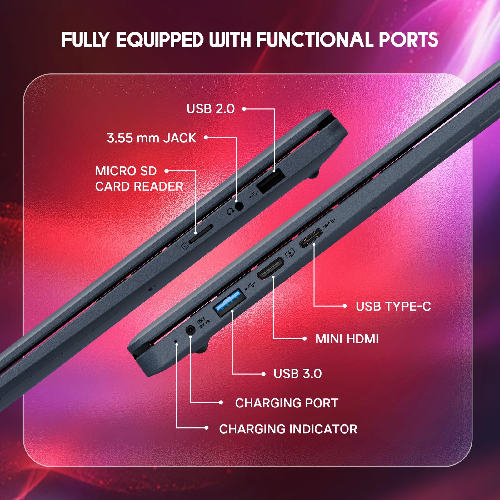- Multiple Ports: Equipped with USB 3.0, Type-C, Mini HDMI, a Micro SD card slot, and a 3.5mm audio jack, it offers versatile connectivity options for all your devices and accessories.