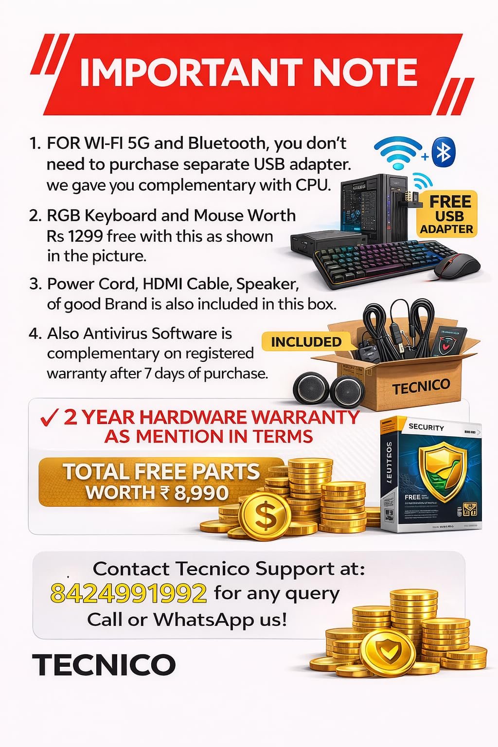 Details: Unlock the power of productivity with this high-performance desktop computer from TECNICO. Equipped with an Core i5 processor, 8GB of DDR3 RAM, and a 128GB solid-state drive (SSD) paired with a 500GB hard disk drive (HDD), this system delivers lightning-fast boot times and smooth multitasking capabilities. The 19.5-inch HD LED monitor provides crisp visuals, while the included keyboard and mouse ensure seamless navigation. Stay connected with built-in WiFi and enjoy the latest Windows 11 operating system. With a 2-year warranty, this desktop computer is a reliable investment for all your computing needs. Elevate your workspace and experience uncompromising performance.2 YEARS ON MOTHERBOARD , HARDISK, RAM, SSD OTHER ACESSORIES 1 YEAR WARRENTY